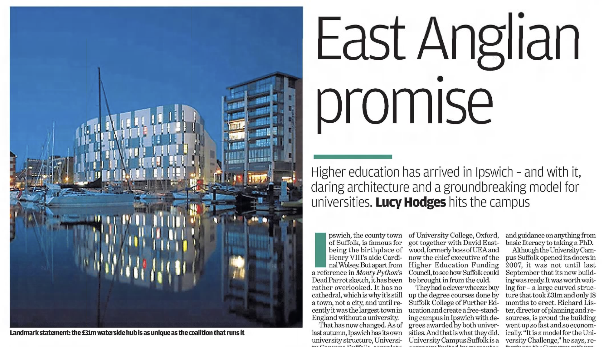 Denham sold UCS as both a response to education under-supply and an enabler of economic regeneration. Later coverage in The Independent made the same point in more colourful language – Ipswich finally had its own glamorous waterfront campus “full of thousands of students.”