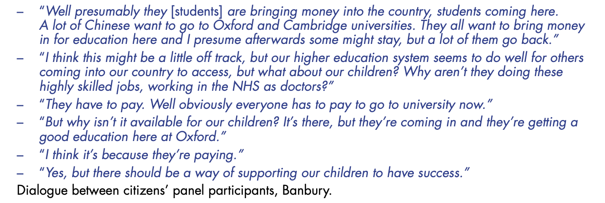 In its “National Conversation on Immigration” in 2018, citizens’ panels for British Future saw real benefits of international students – it called for student migration and university expansion to be used “to boost regional and local growth in under-performing areas,” and for any major expansion of student numbers to be government-led with the explicit aim of spreading the benefits more widely, including via regional quotas on post-study work visas and new institutions in cold spots.