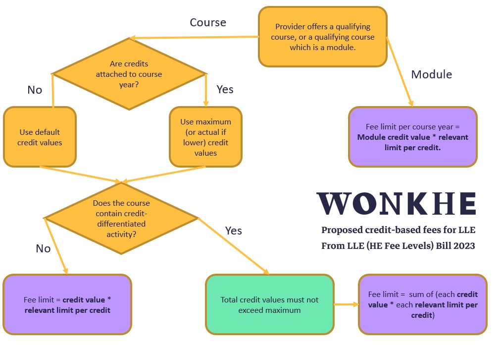 A key objective of the LLE is that a learner should not have to pay more if they pay module by module rather than for a whole year of the course. The Secretary of State will therefore set maximum amounts for fundable credit available with respect to courses (the example given in the policy summary is that you can’t charge more than 360 credits for a three year honours degree).