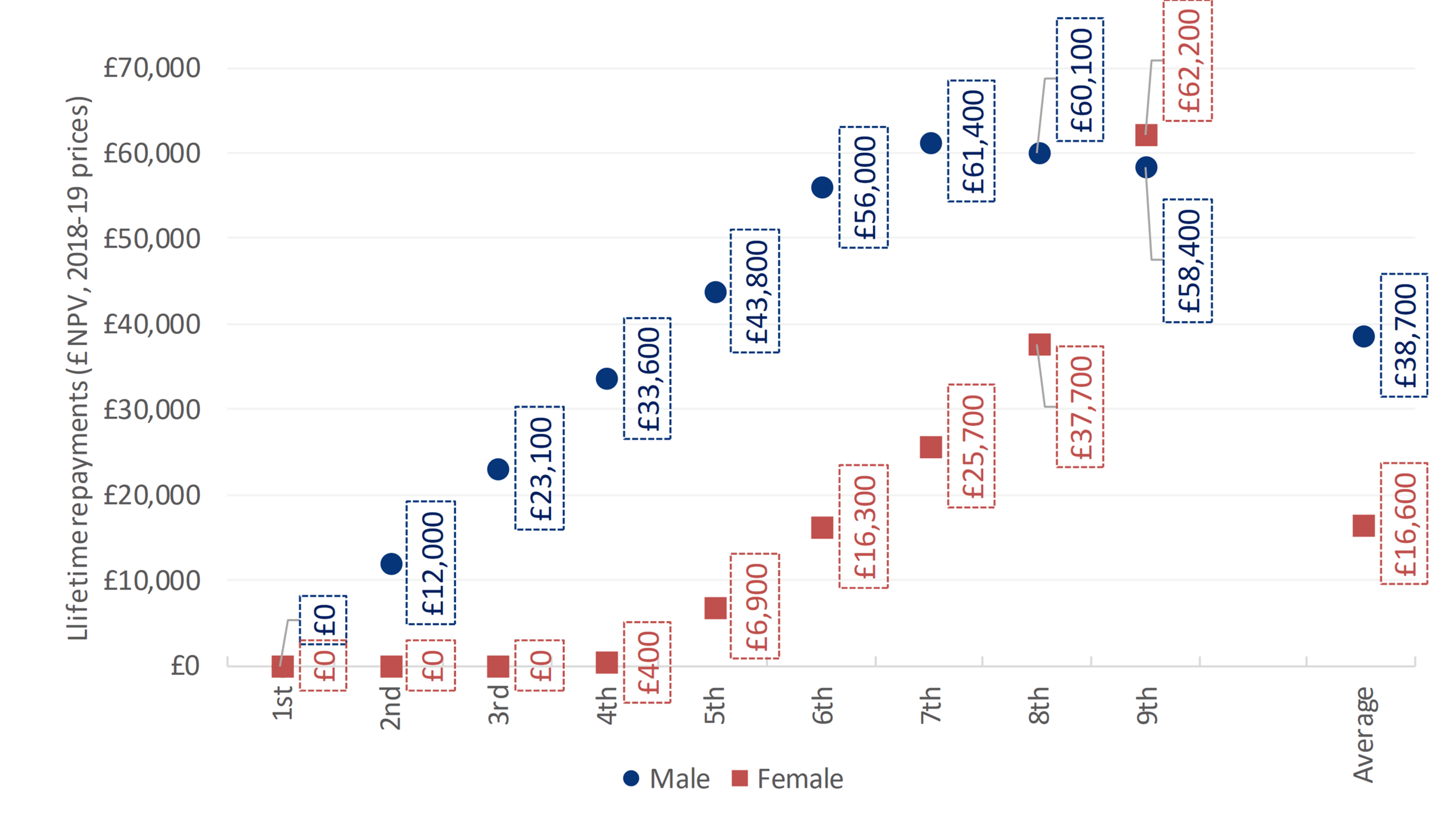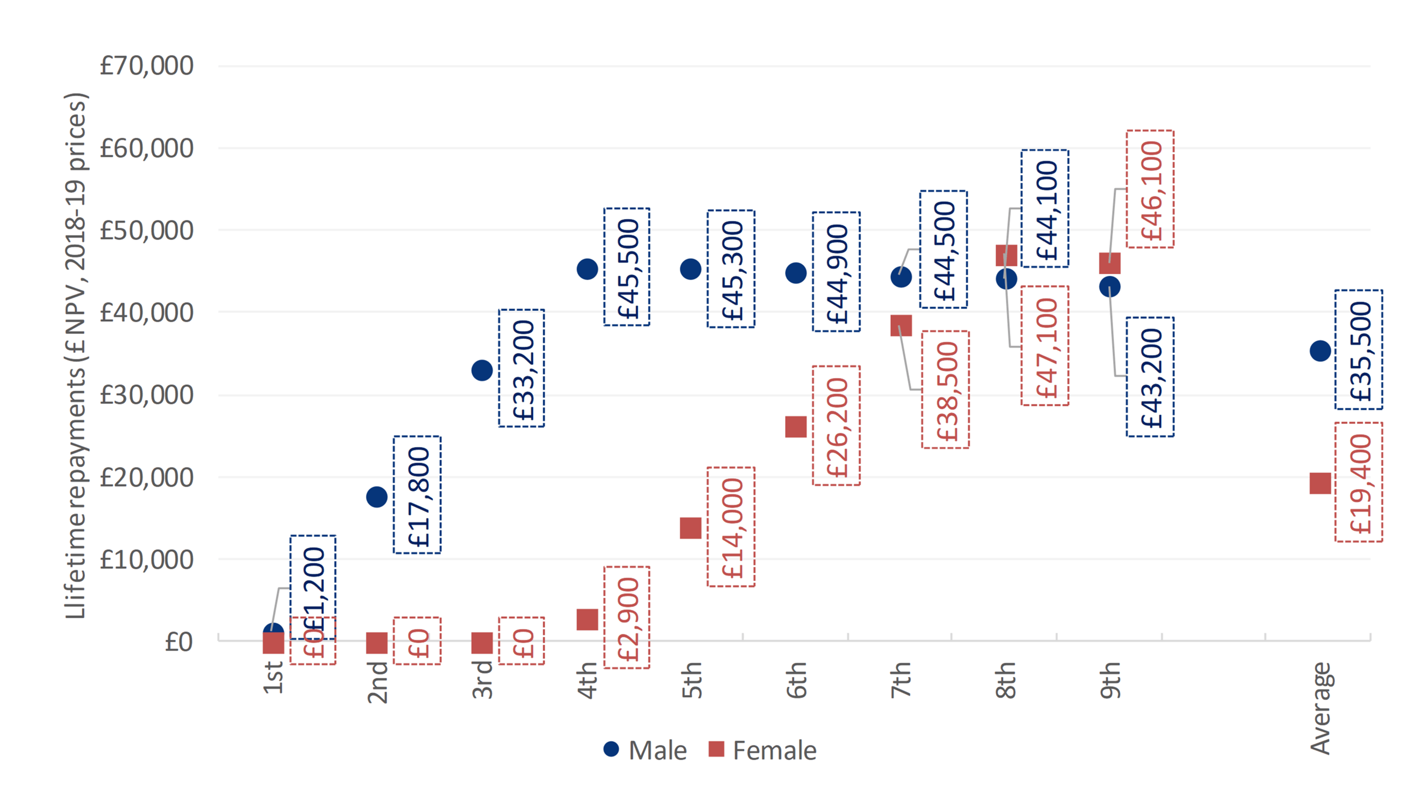 - Average lifetime loan repayments (NPV in constant 2018-19 prices) for students undertaking full-time undergraduate degrees are £38,700 for men and £16,600 for women.