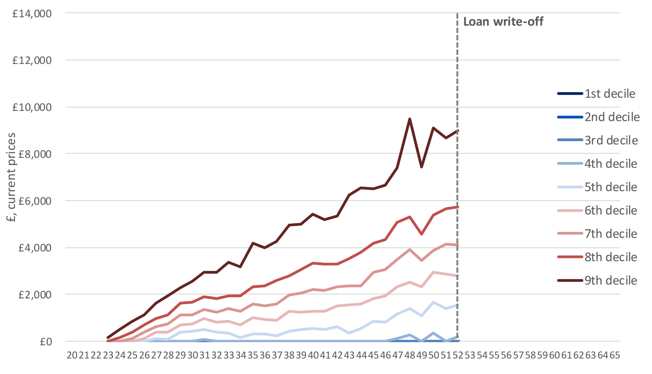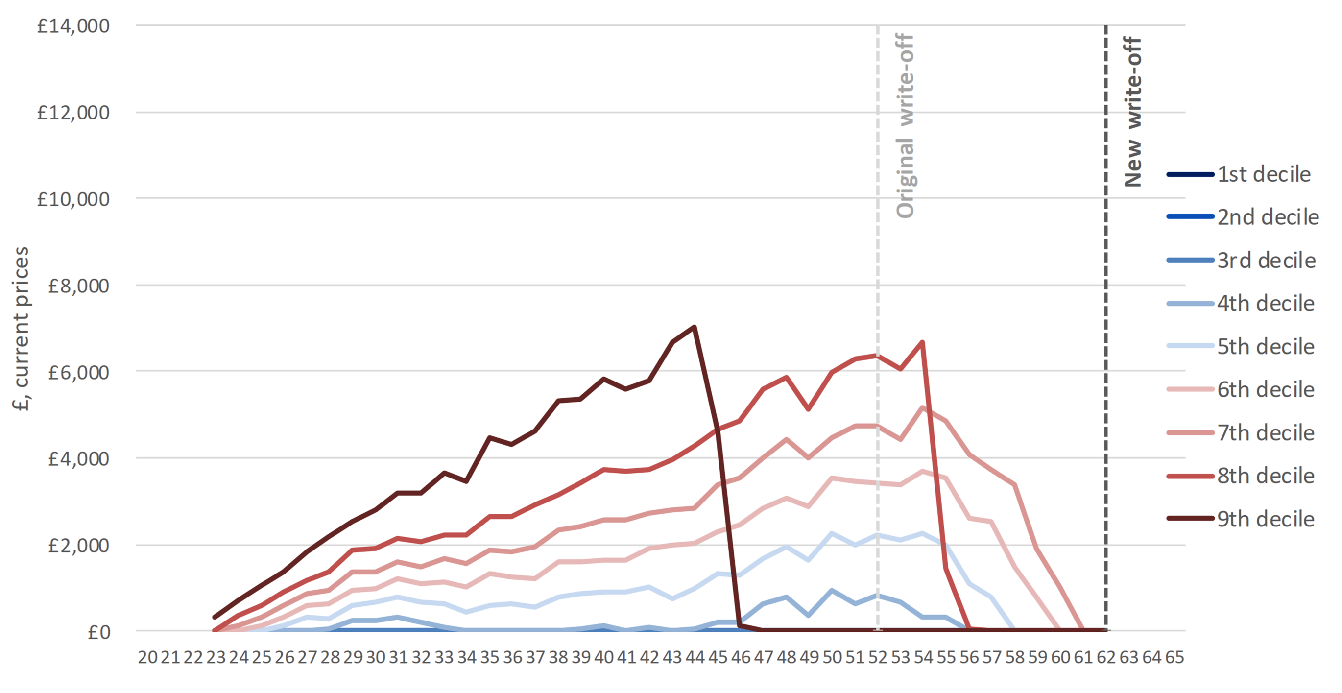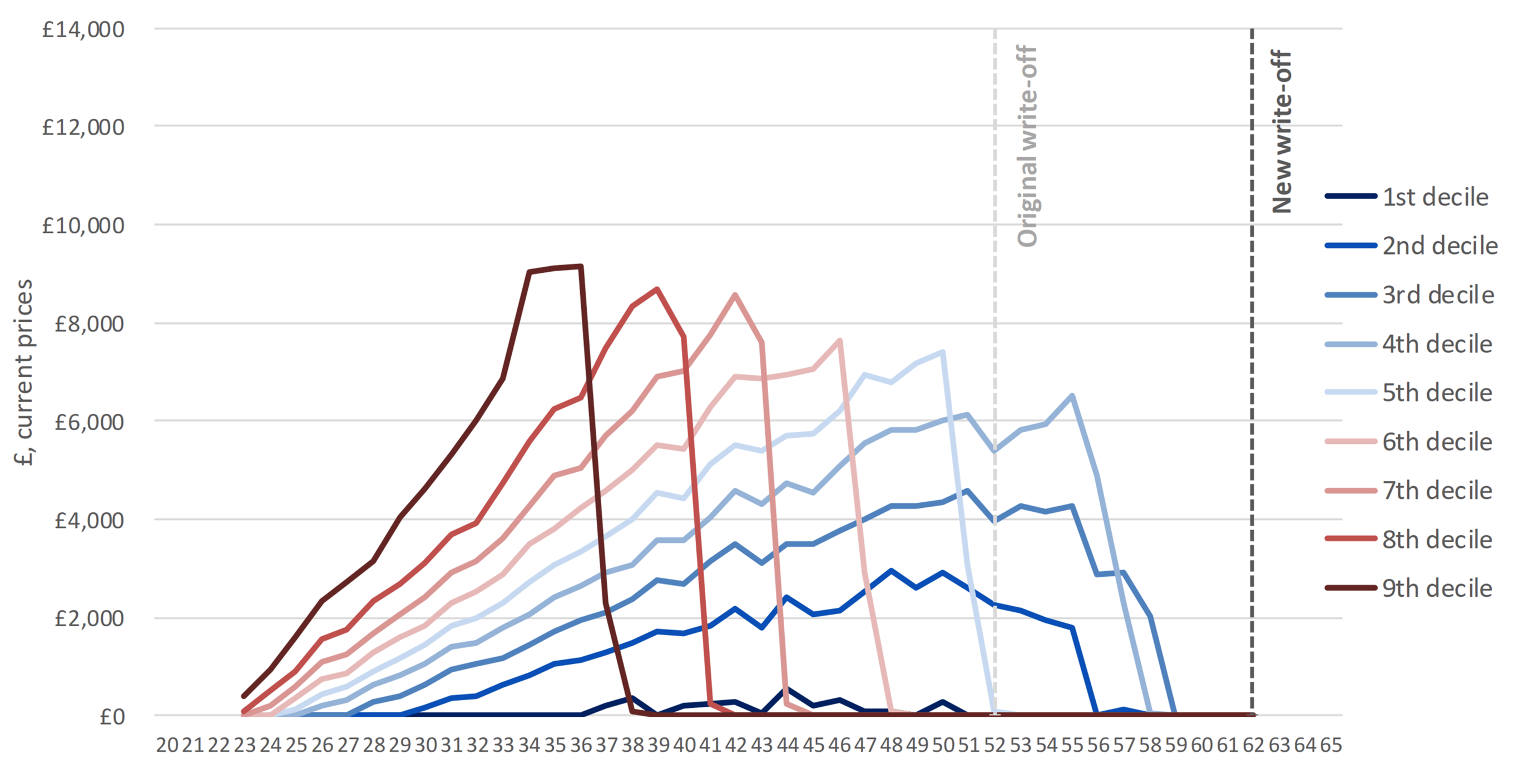 - Graduates (predominantly female) with moderate earnings, who are likely to end up repaying more over the extended repayment period than is currently the case – though we have not modelled the impact of the proposed cap on loan repayments;