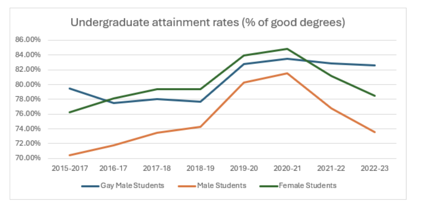 In fact, gay male students have consistently outperformed not only their heterosexual male peers but, in several years, even heterosexual women. In 2022–23, 82.6 per cent of gay men achieved a Good Degree, compared with 73.6 per cent of men overall and 78.5 per cent of women.
