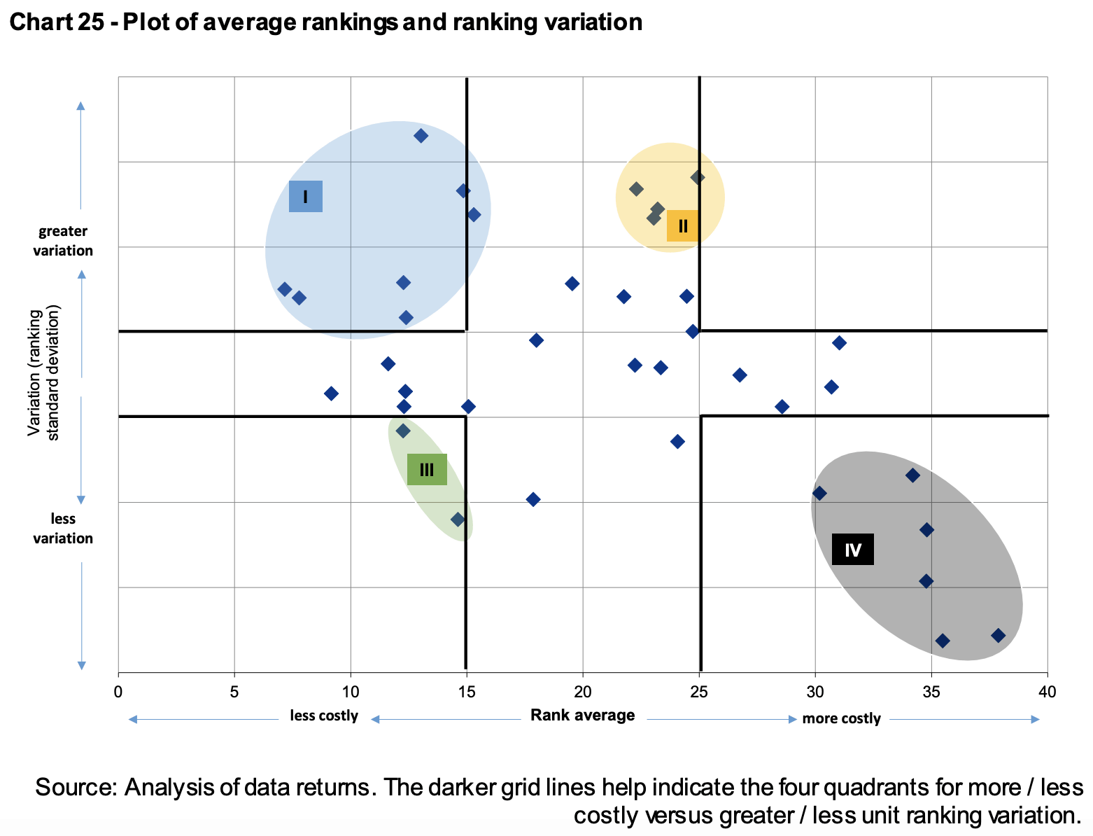 Chart 25 is one to give finance managers palpitations. There are groups of institutions that cost more than others, and groups with greater variation between subjects than others. Those with greater costs overall and less variation between tended to be in London and less specialised – those with greater costs (though not the most costly by some way) and more variations between subjects were four institutions with very little in common other than a staff-student ratio between 15:1 and 30:1 and a situation in the geographic south.