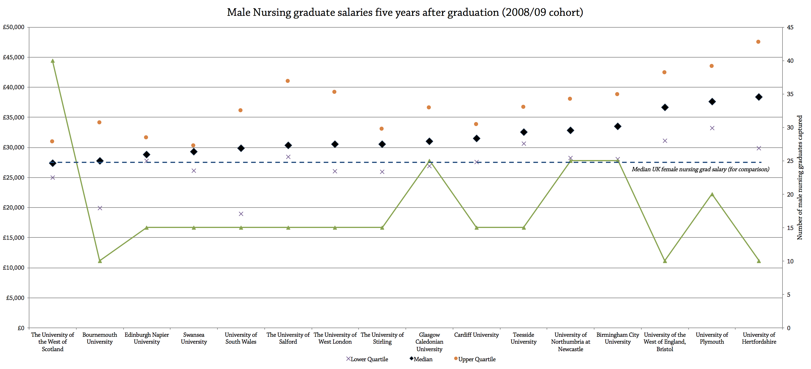 Evidently, it pays to be one of the small number of men studying Nursing. Perhaps most fascinating is that the upper quartile earnings for Nursing graduates at the University of Hertfordshire are a healthy £47,500 after five years.