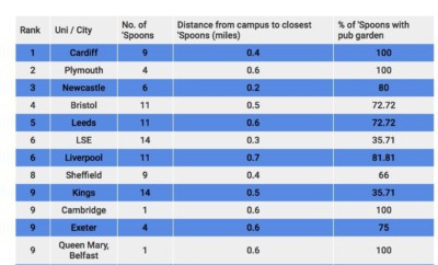 Newcastle drew in third but with the closest ‘Spoons to campus, just 0.2 miles away.