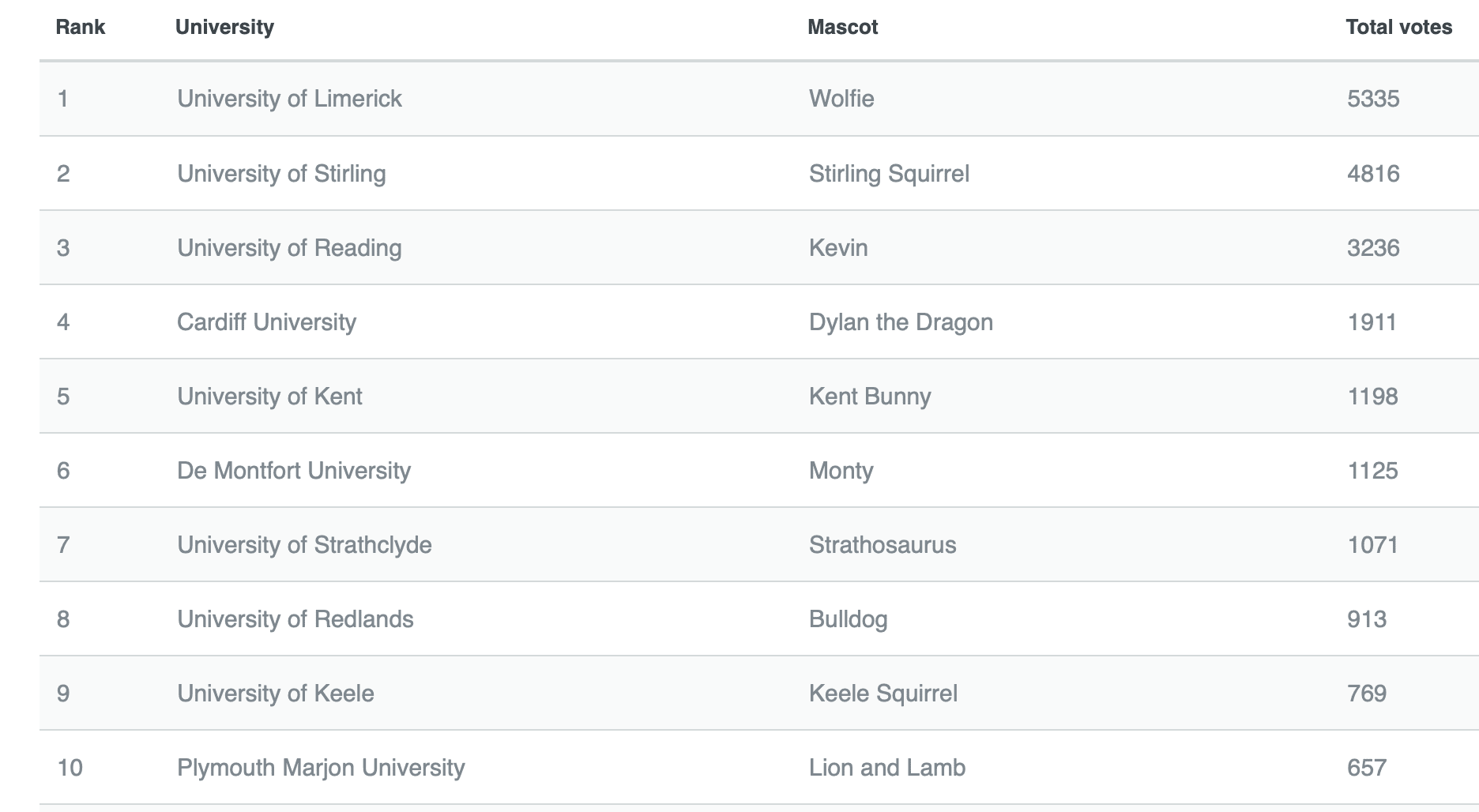 And it would be remiss not to mention here the recent results of the Bantshire University World University Mascot Rankings 2020. Decided by a popular vote and featuring Stirling Squirrel, Dylan the Dragon from Cardiff, Wolfie from Limerick and Kevin the Ichthyostega from Reading, it was a closely fought affair which eventually saw Wolfie coming out on top.