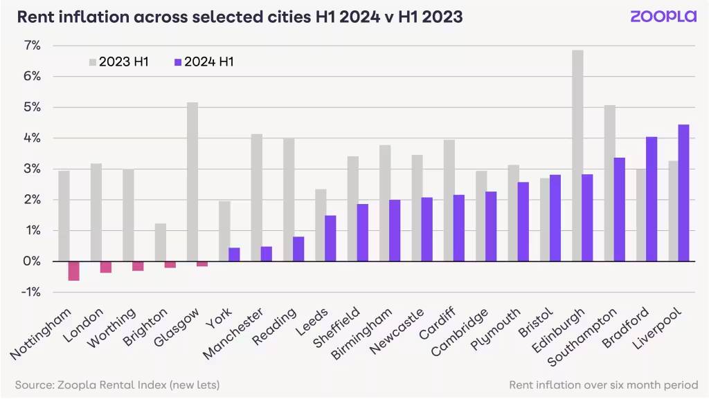 In the first six months of 2024, rents fell in Nottingham, London, Brighton and Glasgow. And rent inflation fell in a whole range of university cities and towns – with only Bradford and Liverpool seeing rent inflation, both of which are widely known to have a surplus of student housing in relation to demand.