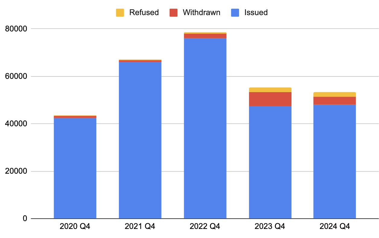 Interestingly though, if we look just at decisions in the quarter, while withdrawals have fallen, it looks like refusals are still ahead of where they were back in Q4 2022: