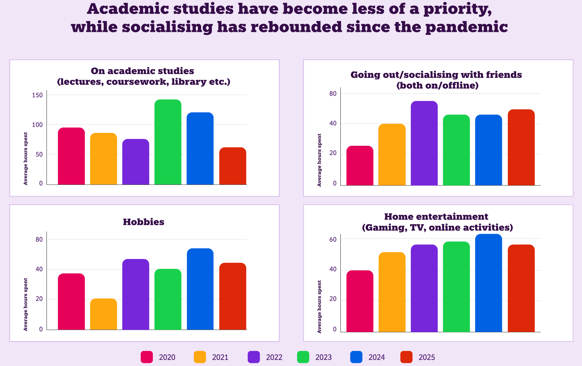 There’s also some lifestyle stuff. Imagine working up the graphics for this chart – which seems to be suggesting that the UK’s undergraduates have more than halved the time spent on studies YOY – and not raising a red flag.
