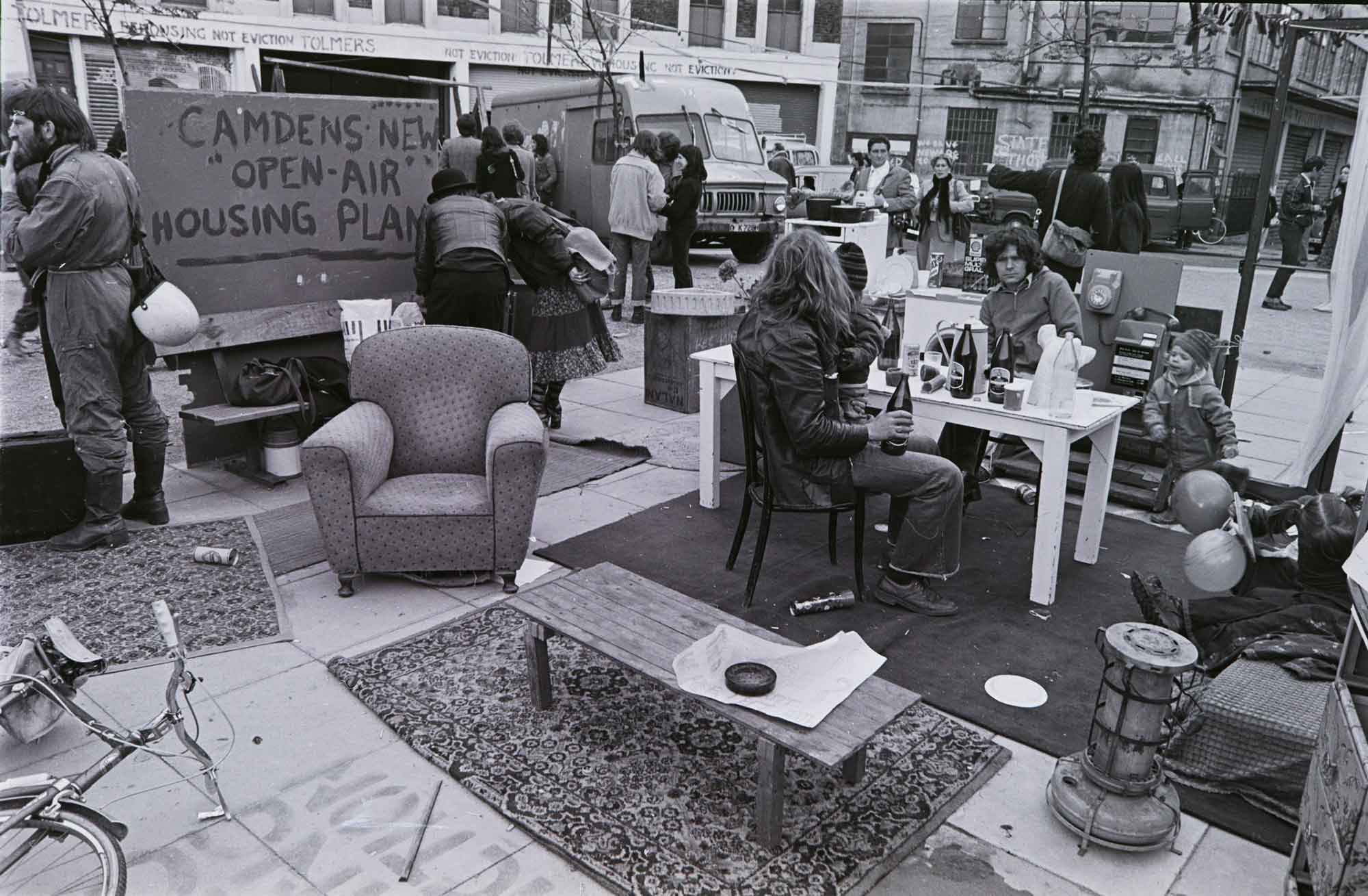 They also formed bonds with squatters who started occupying empty properties in Tolmers from 1974. Many of the squatters were themselves students or recent graduates, politicised by the era’s radical currents. They brought energy, creativity, and sometimes confrontation to the movement. Direct action – bonfires on derelict land, occupations of vacant offices, impromptu gardens – sat alongside more formal lobbying of Camden Council.