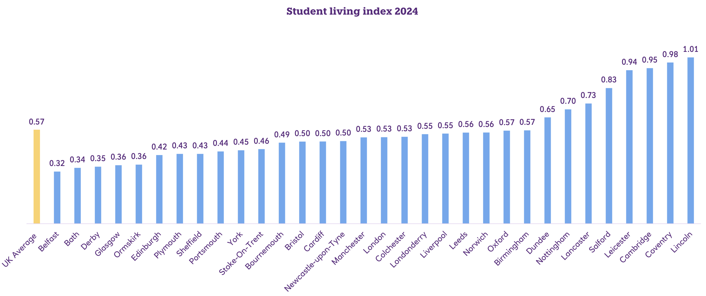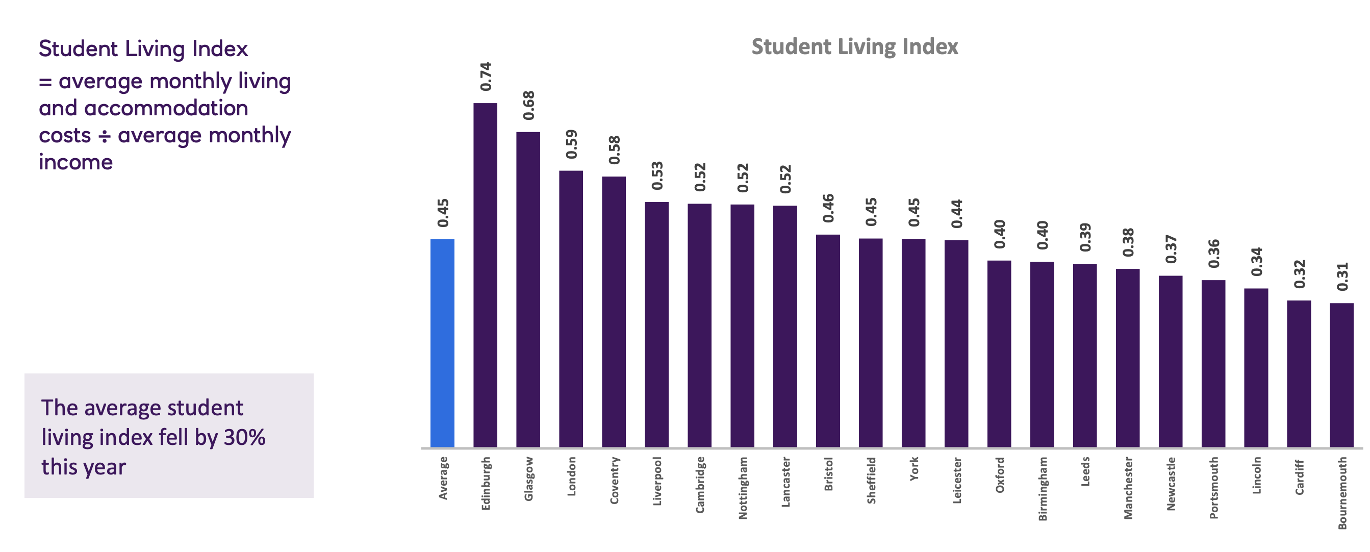 It’s [a] useful guide to what students around the UK are spending their money on, where they’re finding their income, and how they feel about their finances. Dividing a city’s average student spending by average student income gives you that city’s Student Living Index – a number that indicates how affordable it is to live there. In the 2023 report, we were ranked 4th in the UK.