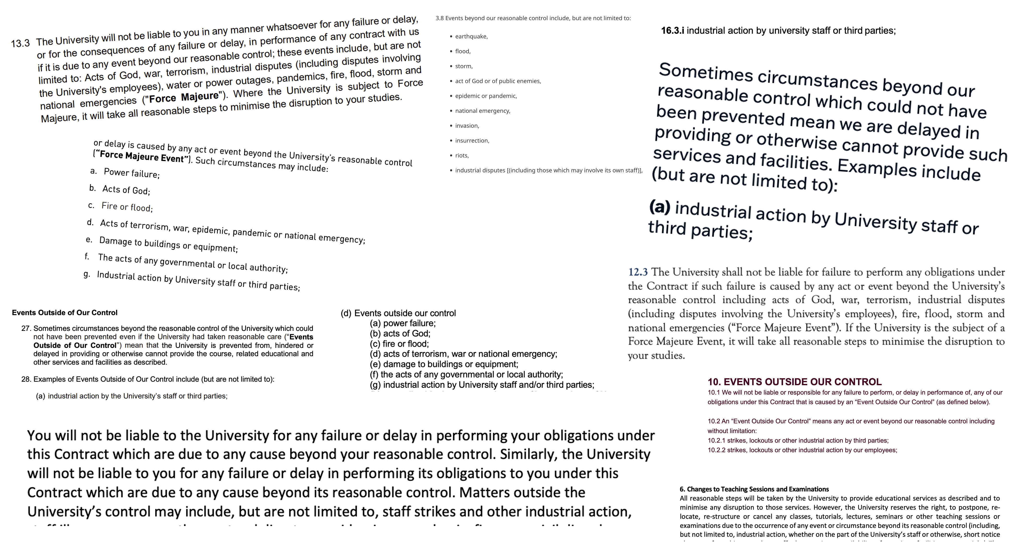 From those I’ve looked at (over 60 in England), about a third are obvious breaches – they explicitly list industrial action by their own staff as a force majeure event that limits their liability. Multiple institutions openly put disputes with their own employees inside the “events outside our control” carve-out.