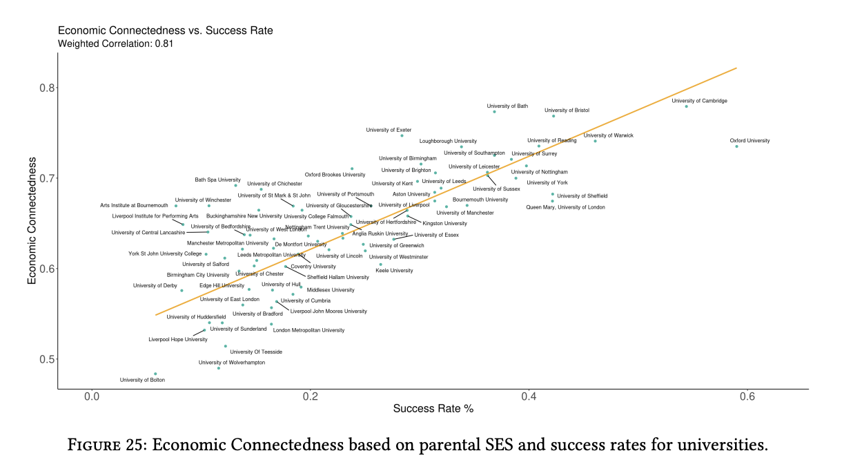 Probably the most interesting finding for me emerges in this chart – which plots economic connectedness against universities’ success rates, defined as the proportion of FSM-eligible students who reach the top quintile of earners by age 30. The correlation coefficient of 0.82 represents an astonishingly strong relationship: