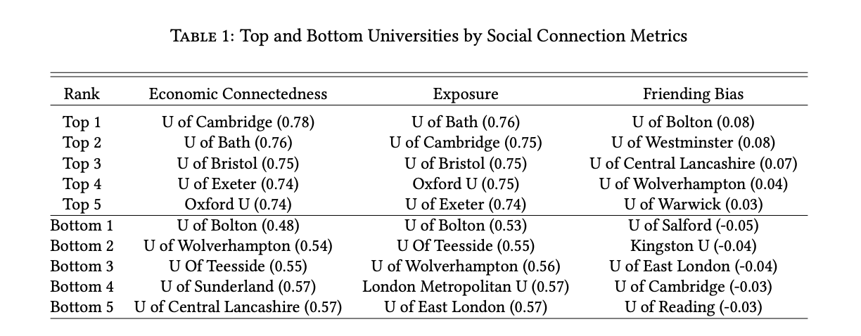 But that exposure varies hugely across universities. Economic connectedness (EC), exposure to high-SES individuals, and friending bias tell quite the story about institutional stratification.