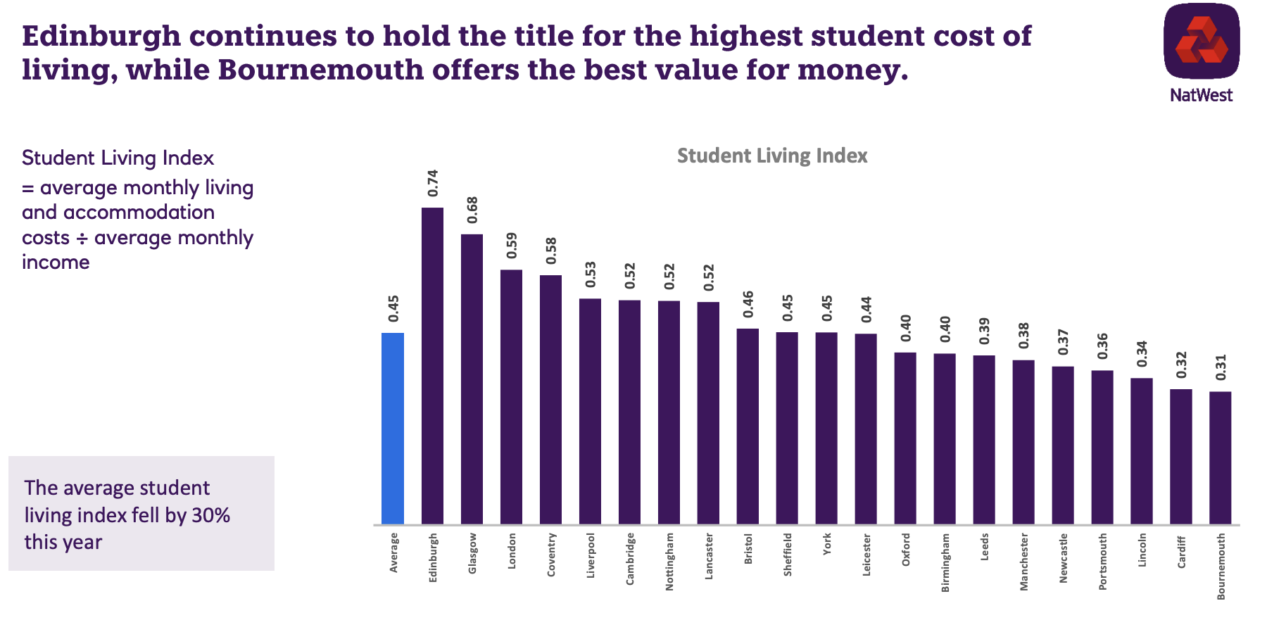 So for example, it says that Edinburgh, Glasgow, Leeds and Canterbury have replaced London as the regions with the highest student cost of living, Edinburgh is the only city in the UK where student spend/costs outweigh their income, and the best student living index this year goes to Cardiff – its index score having halved from 2021 to this year.
