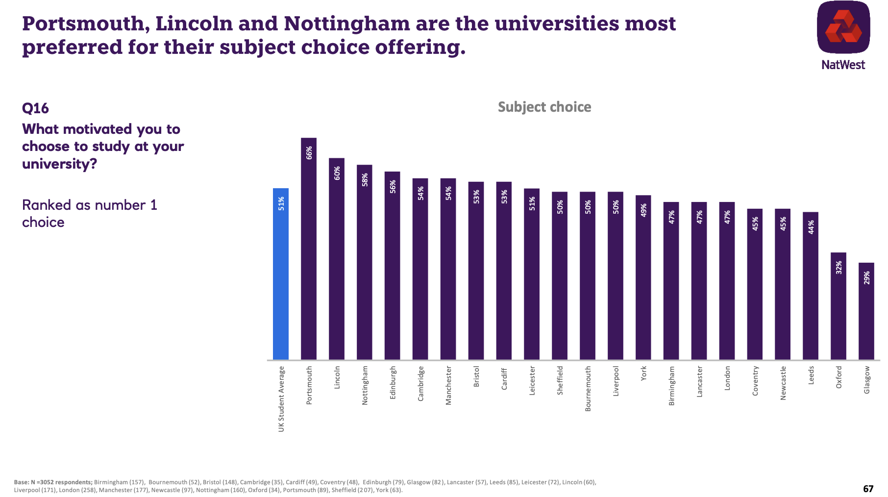 As usual, the PDF plays fast and loose with places. In theory the top six “universities” preferred on the basis of subject choice are Portsmouth, Lincoln, Nottingham, Edinburgh, Cambridge and Manchester – but the sample size on those pages is the same as others describing those places as “regions”.
