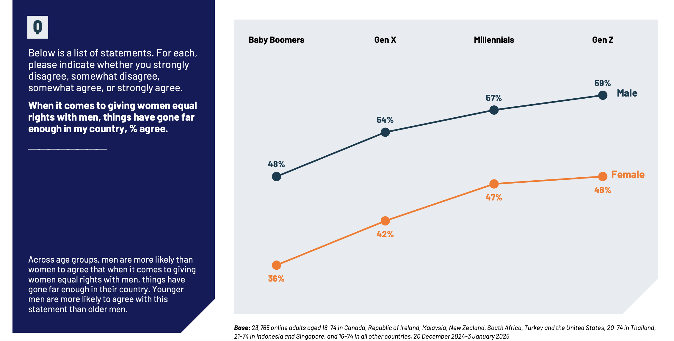 Even if you ignore the gender differences, Gen Z as a whole perceives significantly more gender tension in society than older generations. 59 per cent of Gen Z acknowledge tension between men and women, while only 40 per cent of Boomers share this perception.