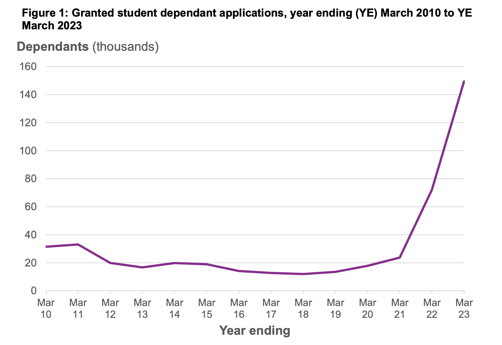 The rapid rise in dependant visas is a story we’ve told before on the site – if nothing else, the impact assessment for the change from the old “Tier 4” to the “student route” simply didn’t see dependants coming.