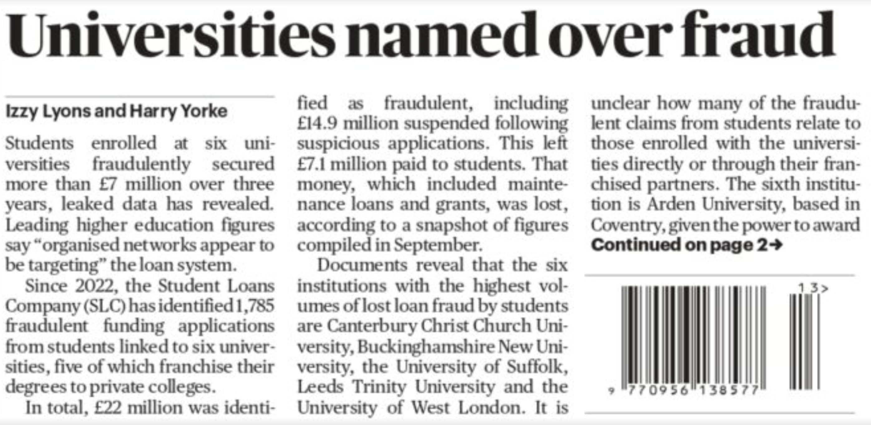 Now its front page names the “six institutions with the highest lost loan fraud by students” – said to be Canterbury Christ Church, Buckinghamshire New, Suffolk, Leeds Trinity, West London and Arden.