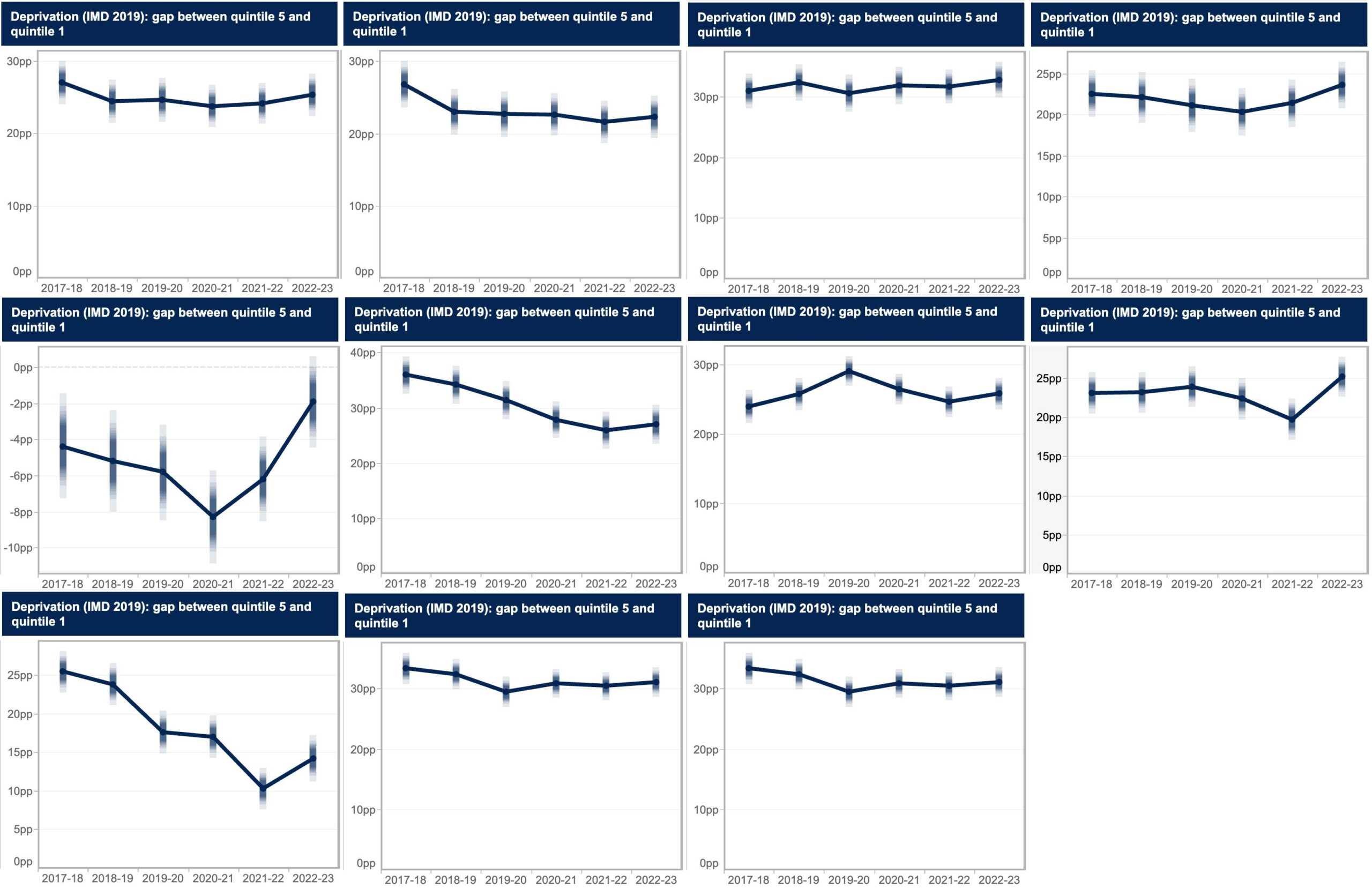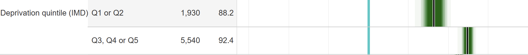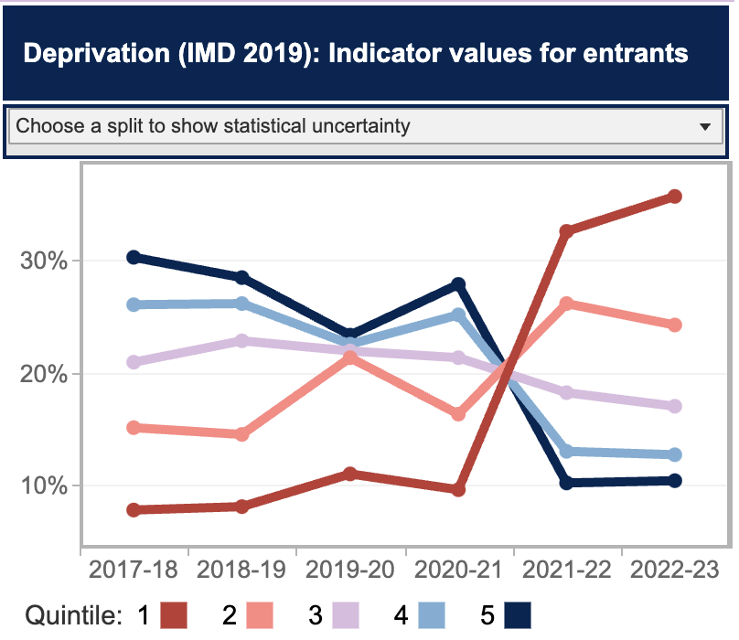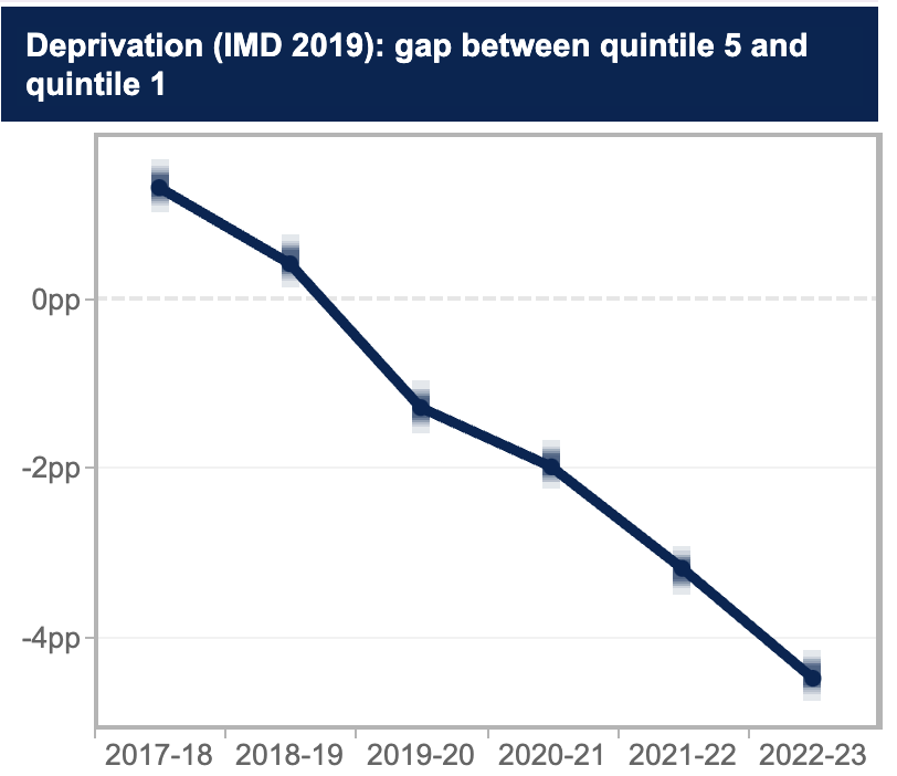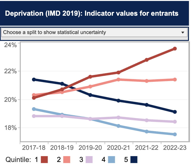 At the headline level, deprivation quintiles have moved in a remarkably positive direction – with quintile 1 moving from just over 20 per cent of the undergraduate entrants to 25 per cent. Well done everyone.