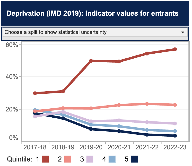 So the big progress must surely be elsewhere in the sector. And for some providers, the turnaround has been astonishing. Here’s one university that has completely reversed the dominance of IMD Quintile 5 students: