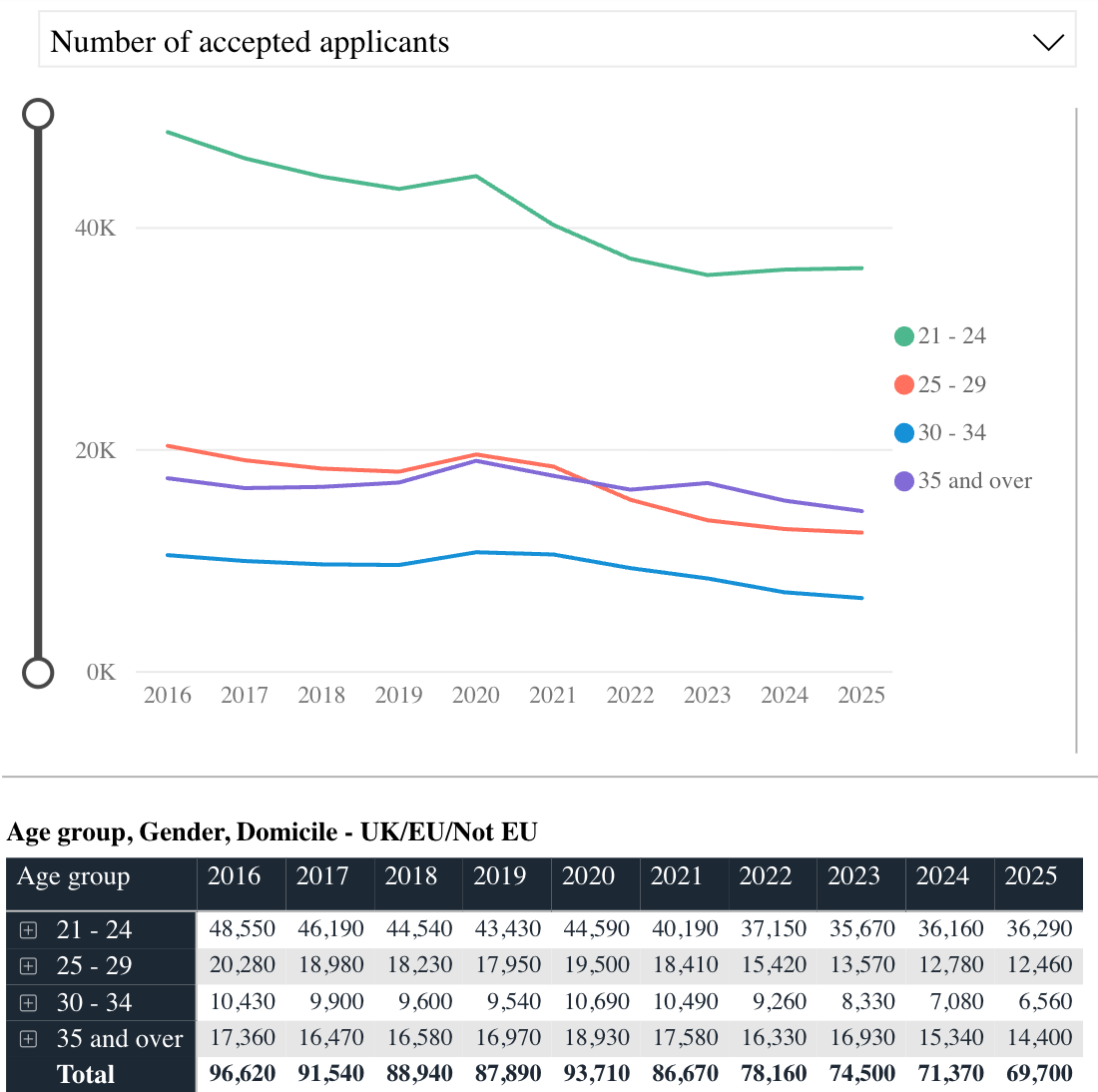 UCAS data on accepted applicants shows a pretty catastrophic mature student decline between 2016 and 2025: