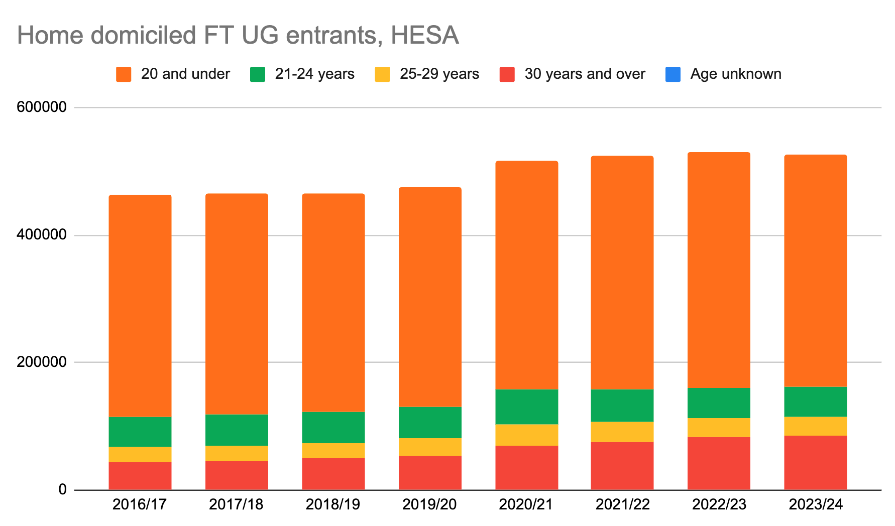 The 30+ figure is particularly notable – while UCAS shows this group declining by thousands, HESA shows it nearly doubling from around 44,000 to 85,000 annual entrants.